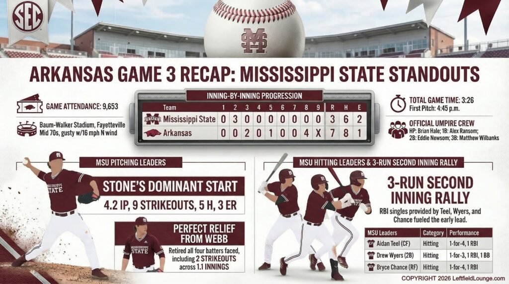 Scoring Summary Mississippi State jumped out to an early lead in the top of the second inning. Drew Wyers opened the scoring with an RBI single to center field, bringing home Ryder Woodson. Bryce Chance followed with an RBI single to score Chone James, and Aidan Teel capped the inning with an RBI single to left that scored Blake Bevis, giving the Bulldogs a 3-0 advantage.
