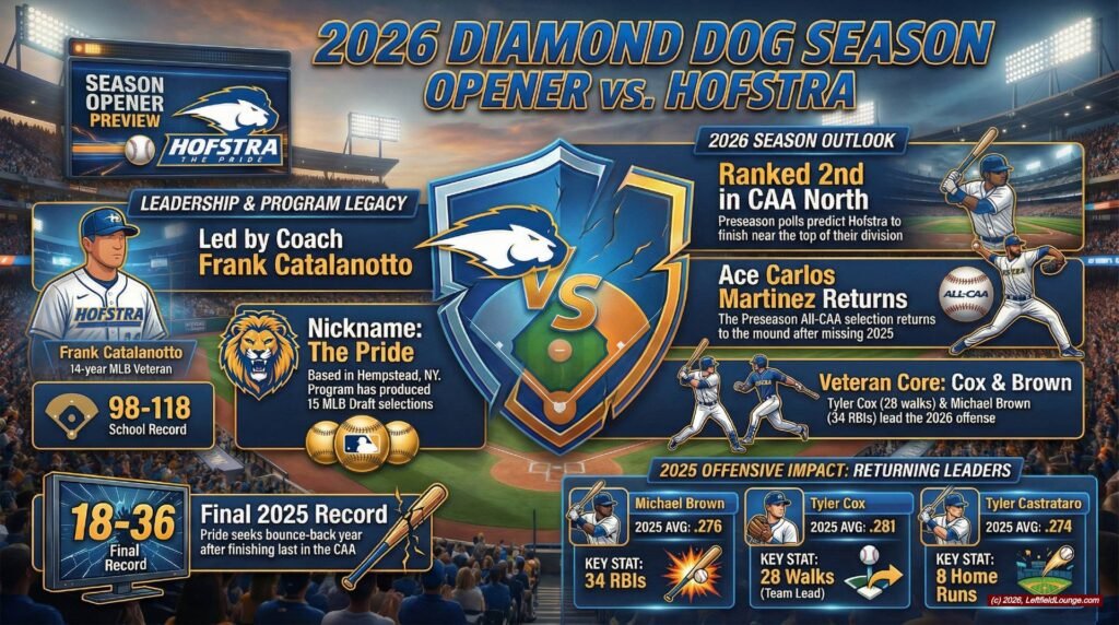 Head Coach Frank Catalanotto enters his fifth season with a resume that commands immediate respect. A 14-year MLB veteran, Catalanotto’s career trajectory—transitioning from a Division II World Series appearance with New York Tech in 2019 to securing a CAA title and NCAA Regional berth with Hofstra in 2022—proves his developmental model works. While his Hofstra record sits at 98-118 (144-139 overall), his professional stature has successfully professionalized the program’s competitive atmosphere. To return to the winner’s circle, however, his veteran coaching staff must now address the fundamental defensive and pitching lapses that derailed the 2025 campaign.